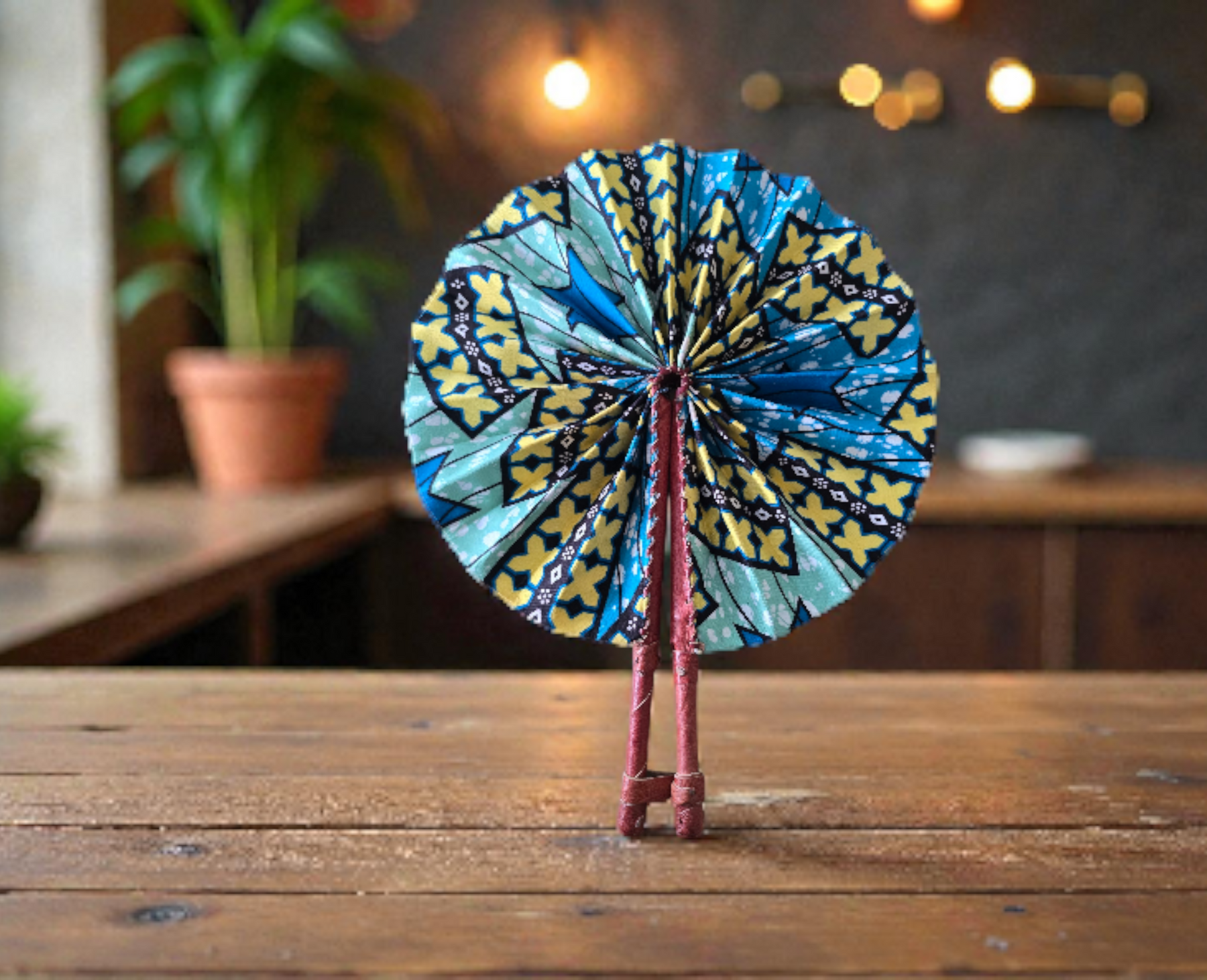 Each fan showcases vibrant Ankara fabric and traditional Ghanaian craftsmanship, making it a cooling accessory and a piece of art.