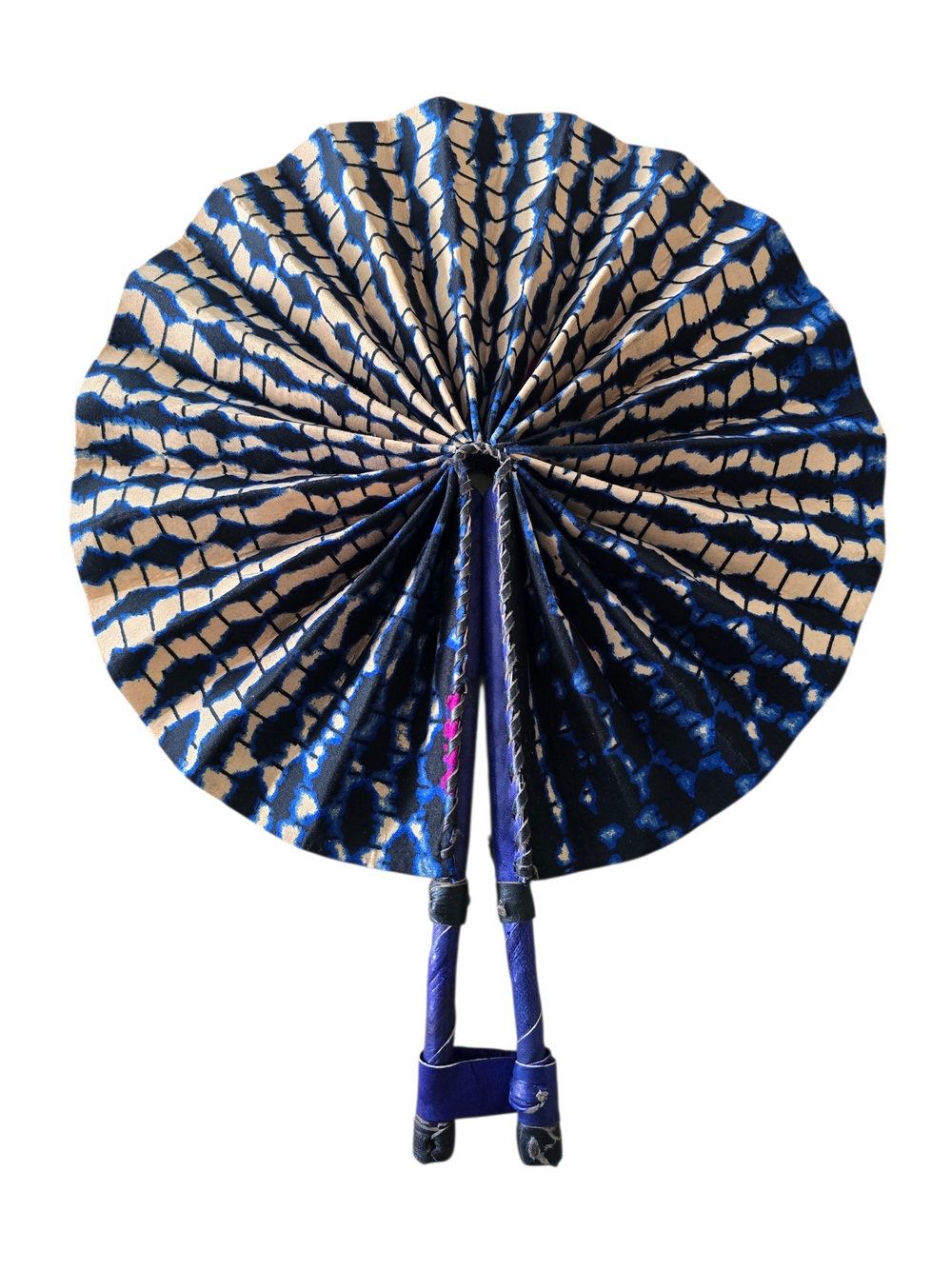Each fan showcases vibrant Ankara fabric and traditional Ghanaian craftsmanship, making it a cooling accessory and a piece of art.
