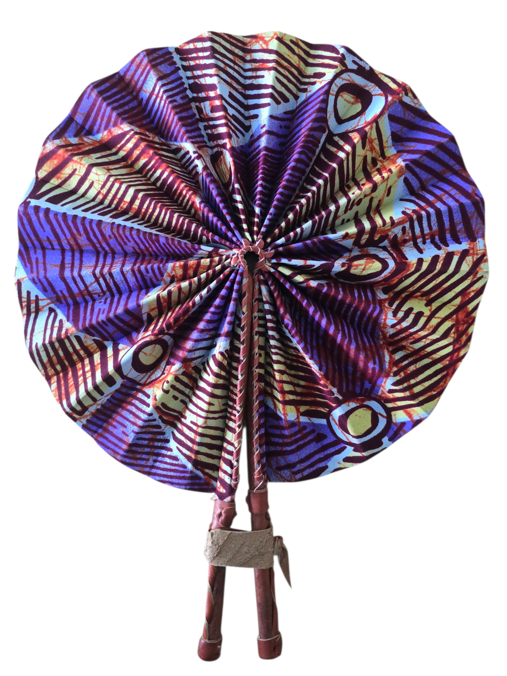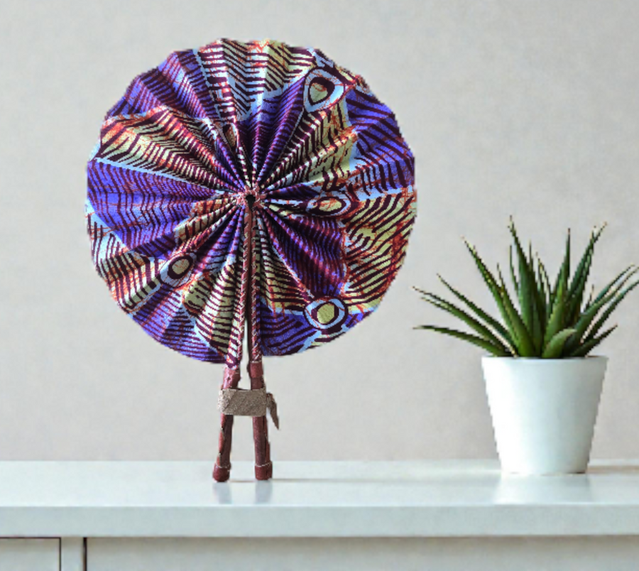 Each fan showcases vibrant Ankara fabric and traditional Ghanaian craftsmanship, making it a cooling accessory and a piece of art.