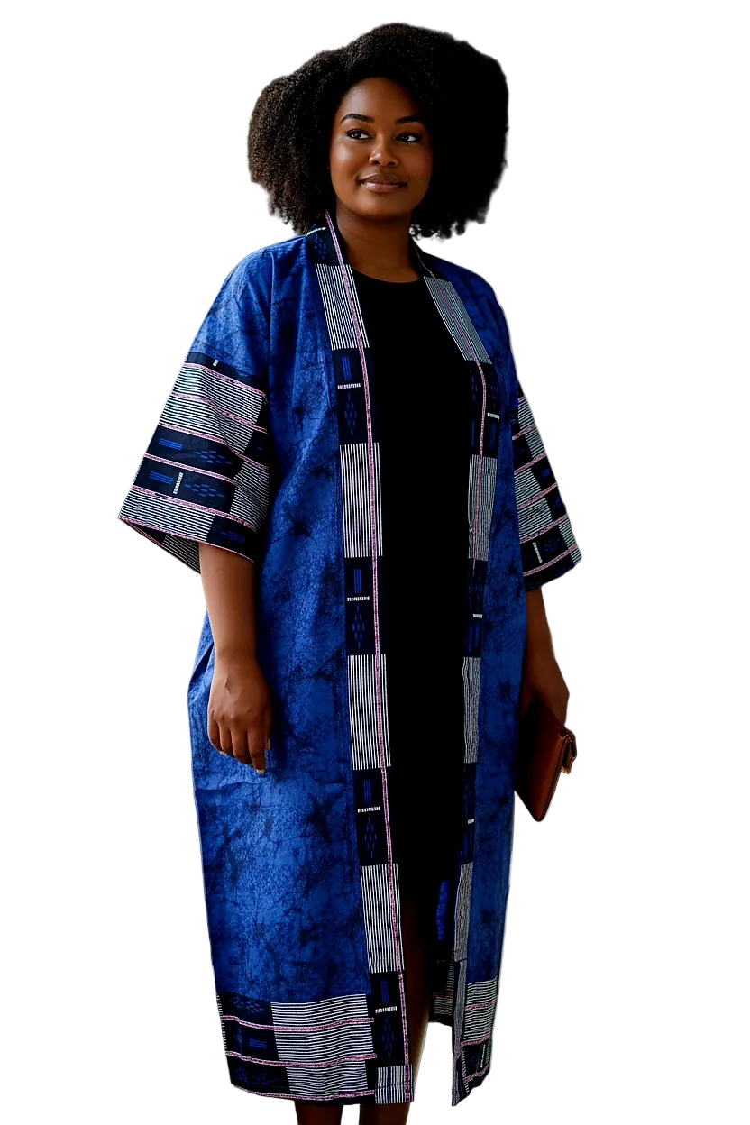 Crafted from vibrant Ntama (Ankara)fabric, the kimono features a relaxed, open silhouette designed for movement and everyday wear. Clean lines and woven detailing add subtle structure, allowing the piece to feel both powerful and effortless.