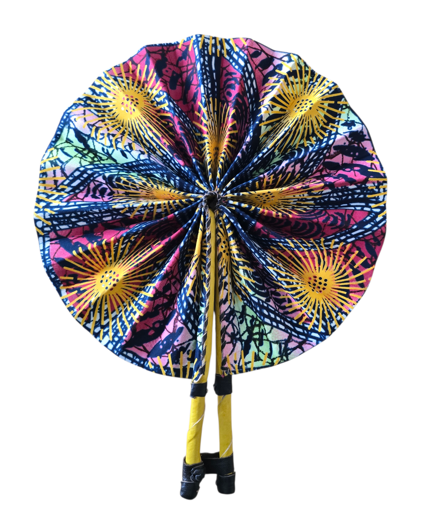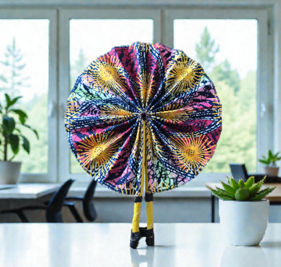 Each fan showcases vibrant Ankara fabric and traditional Ghanaian craftsmanship, making it a cooling accessory and a piece of art.