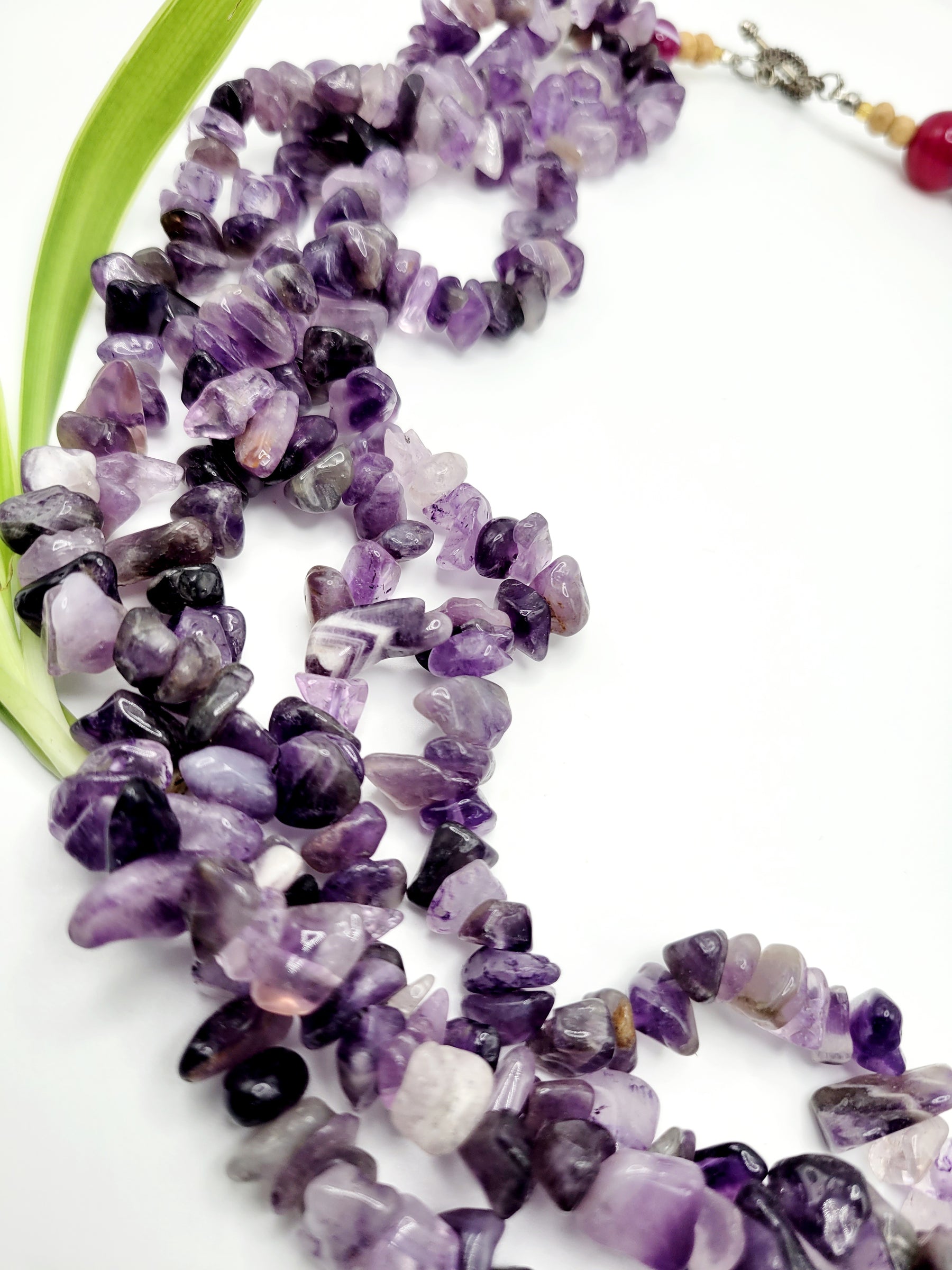 Grace meets grounding energy in Ami, a stunning handmade statement piece by Anastasia of Afiyo Creations. This one of a kind piece blends the calming hues of amethyst chips with the earthy elegance of recycled glass beads, thoughtfully handcrafted in Ghana.
