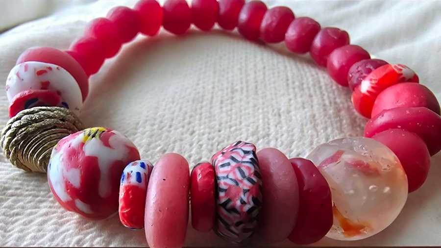 The Kor.Le.Kour "Dzorlo" (One of a Kind) bracelets combine all three types of beads from Odumasi Krobo: opaque, transparent, and recycled. Priscilla Agyeman, the creative mind behind Korlekour, collects recycled glass from clients' homes and restaurants to make these beads.