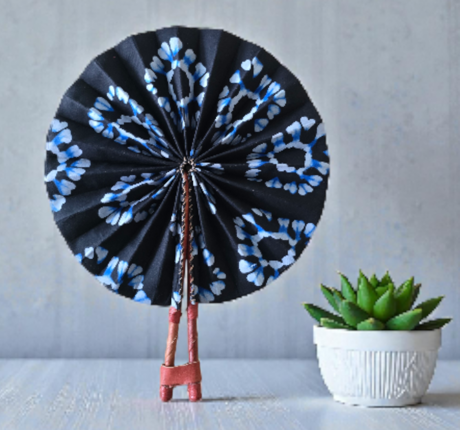Each fan showcases vibrant Ankara fabric and traditional Ghanaian craftsmanship, making it a cooling accessory and a piece of art.